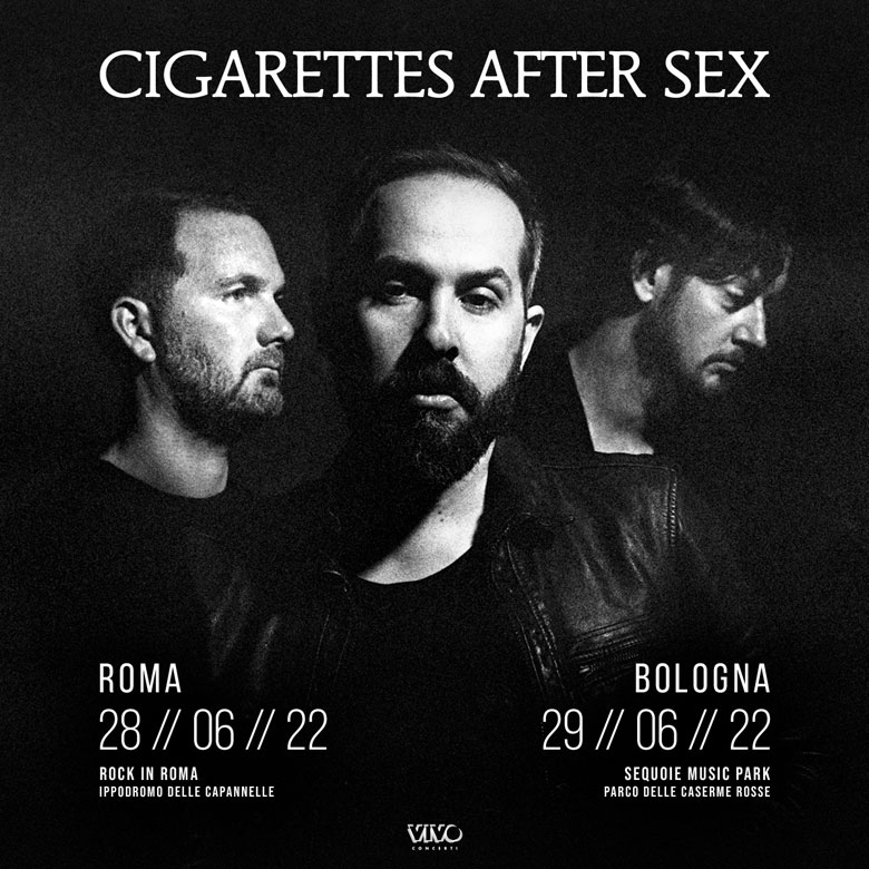 I CIGARETTES AFTER SEX annunciano il recupero delle date italiane, che si terranno al ROCK IN ROMA martedì 28 giugno 2022 e al Sequoie Music Park di Bologna mercoledì 29 giugno 2022. I live sono organizzati da Vivo Concerti. I biglietti già acquistati rimarranno validi per le nuove date.